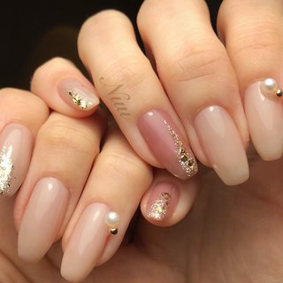 オールシーズン オフィス ブライダル ハンド シンプル Plusのネイルデザイン No ネイルブック ヌーディーネイル オリジナルカラーのヌーディーベージュにラメやスワロフスキーを入れてシンプルキラキラネイ ネイル シンプル ピンク ネイル ピンク